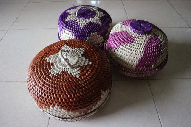 ![]() Beragam anyaman dari pandan dipajang di rumah tenun Mawar Suci di Pulau Palas, Kecamamatan Tembilahan Hulu | ![]() Tudung saji yang terbuat dari pandan |