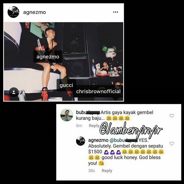 “Yes. Absolutely. Gembel dengan sepatu $1500. Good luck honey. God bless you!” tulis Agnez Mo sambil membubuhkan emotikon tertawa yang tak kalah banyak.