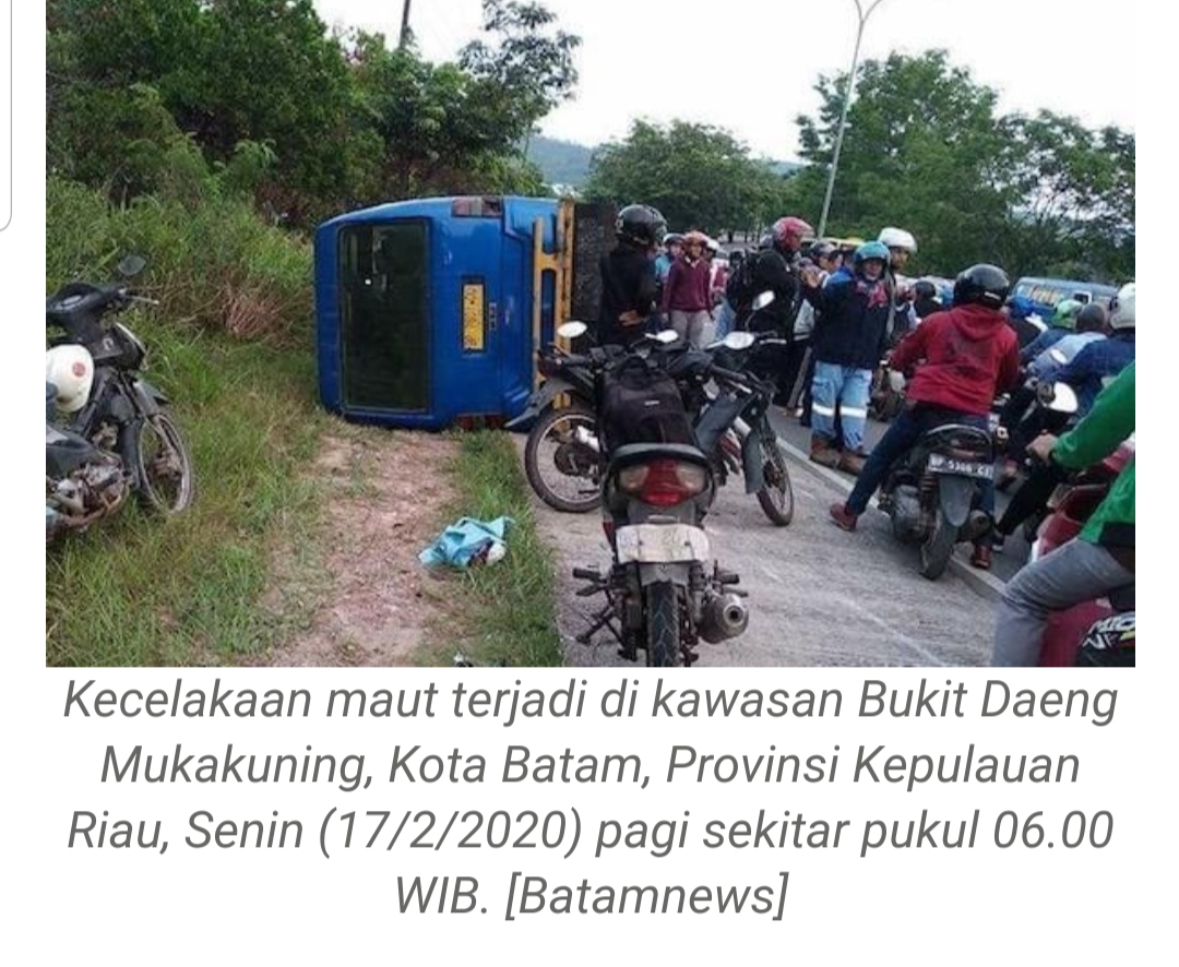 MEDIALOKAL.CO - Kecelakaan maut terjadi di kawasan Bukit Daeng Mukakuning, Kota Batam, Provinsi Kepulauan Riau, Senin (17/2/2020) pagi sekitar pukul 06.00 WIB.