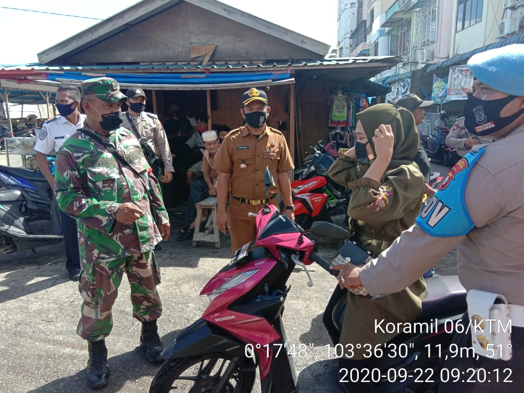 KATEMAN, Medialokal.co - Dalam rangka pencegahan penyebaran virus corona di wilayah kecamatan Kateman, Koramil 06/Kateman bersama Satgas Gabungan melaksanakan sosialisasi peraturan Bupati tentang penegakkan disiplin protokol kesehatan skala besar di kelurahan Sungai Guntung, Selasa (22/09/2020).