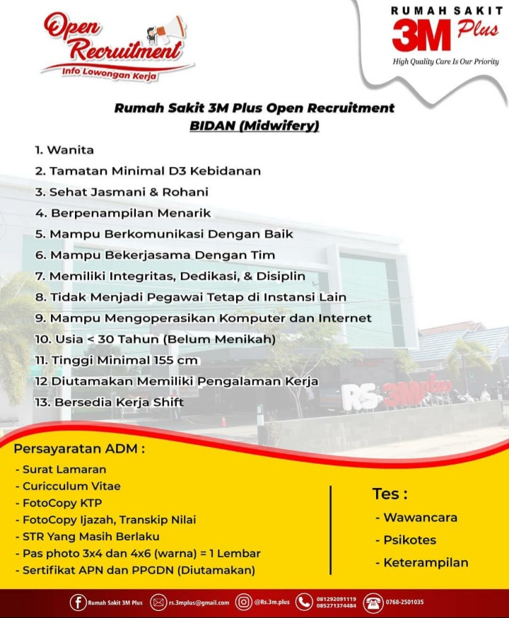 TEMBILAHAN, Medialokal.co - Rumah sakit 3M Plus membuka lowongan kerja untuk Bidan (Midwifery).