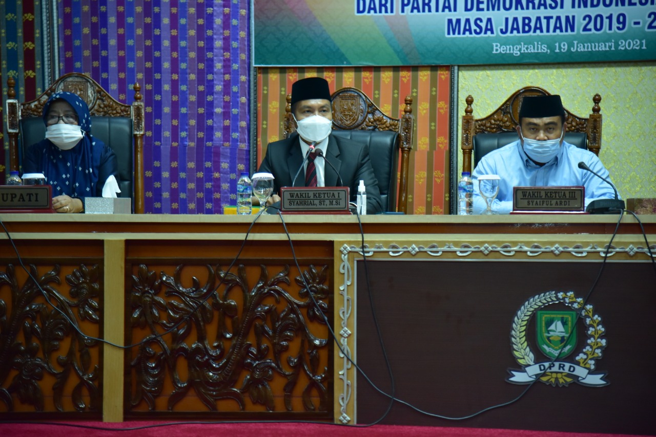 Syahrial,ST.,M.Si menyampaikan Berdasarkan perubahan jadwal Badan Musyawarah DPRD Kabupaten Bengkalis bulan Januari 2021 maka pada hari ini telah diagendakan Rapat Paripurna Penyampaian Ranperda. Dan berdasarkan surat Bupati Bengkalis Nomor : 180/HK/2021/2 tanggal 11 Januari 2021 Perihal Penyampaian Peraturan Daerah.