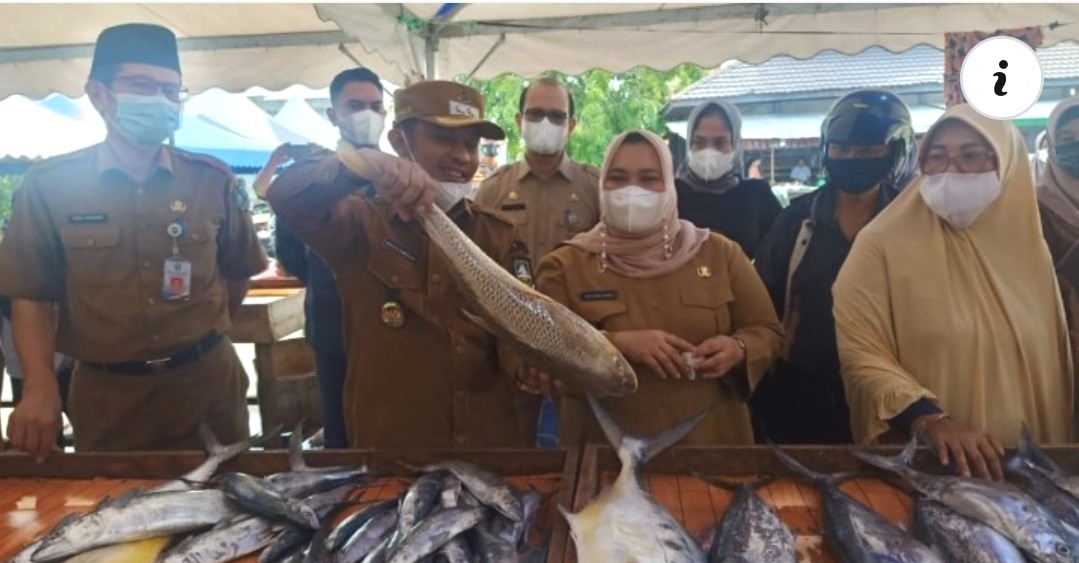 Foto : Bupati Bengkalis Kasmari beserta Wakil Bupati Bengkalis Bagus Santoso didampingi Kadisdagperin Bengkalis H Indra Gunawan melihat Ikan yang dijual dimeja salah satu pedagang Pasar Terubuk Bengkalis