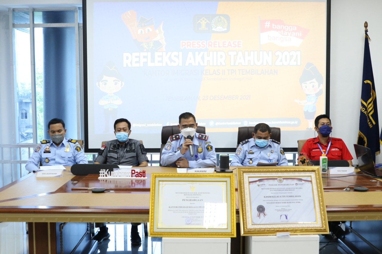 Selanjutnya pada tanggal, 20 Desember 2021, Imigrasi Tembilahan berhasil memperoleh penghargaan sebagai salah satu UPT yang telah berhasil membangun Zona Integritas dengan prediket Wilayah Bebas dari Korupsi (WBK). Capaian Prediket WBK ini diberikan oleh Kementerian Pendayagunaan Aparatur Negara dan Reformasi Birokrasi kepada instansi yang telah berhasil melakukan reformasi birokrasi dibidang pelayanan publik dan pencegahan korupsi. Prediket WBK diberikan kepada Kantor Imigrasi Tembilahan karena telah dinilai berhasil melaksanakan reformasi birokrasi pada 6 area perubahan yaitu:
