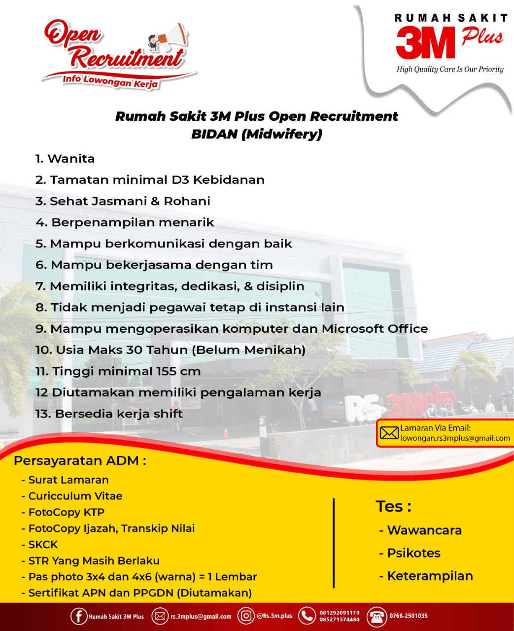 Nahh, bagi Anda yang ingin memasukkan surat lamaran, silahkan langsung ke RS 3M Plus Jalan Lingkar II, No 11-13, Tembilahan, Inhil, Riau.