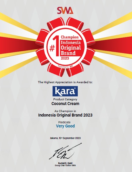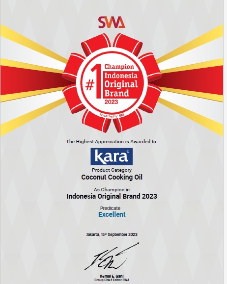 Penghargaan Indonesia Original Award 2023 bukanlah kali pertama yang diraih KARA, khususnya untuk kategori santan dan minyak kelapa. “Dengan mendapatkan penghargaan dari Majalah SWA berkolaborasi dengan Business Digest, KARA mengucapkan banyak terima kasih kepada masyarakat yang telah memilih, percaya dan selalu setia kepada produk olahan kelapa terbaik kami, khususnya untuk produk Coconut Cooking Oil (Minyak goreng kelapa) dan Coconut Cream (Santan kelapa),” tutup Dwianto Arif.