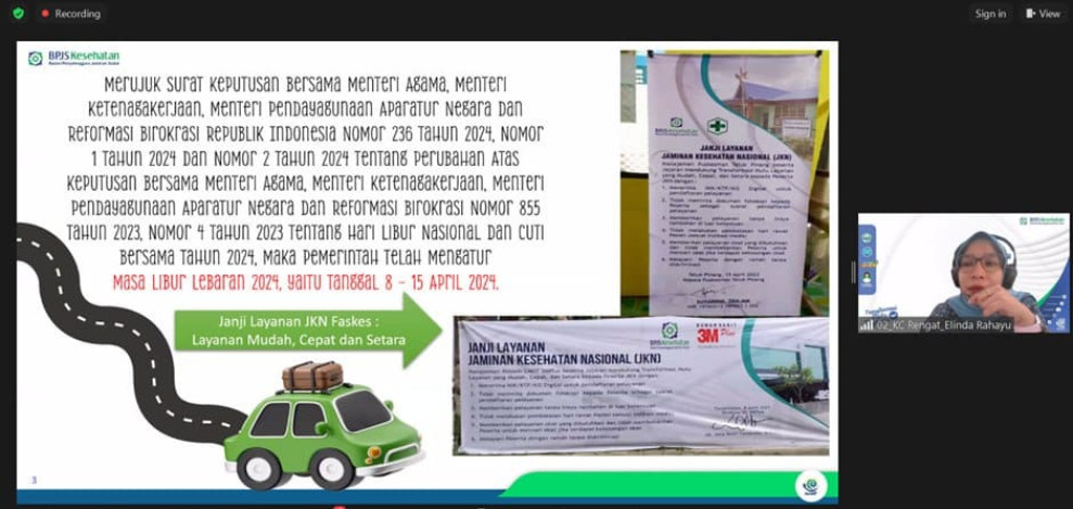 Dalam sosialisasi ini, Kepala Bagian Mutu Layanan Fasilitas Kesehatan BPJS Kesehatan, Elinda Rahayu menyampaikan bahwa berdasarkan Surat Keputusan Bersama Menteri Agama, Menteri Ketenagakerjaan, Menteri Pendayagunaan Aparatur Negara dan Reformasi Birokrasi Republik Indonesia Nomor 236 Tahun 2024, Nomor 1 Tahun 2024 dan Nomor 2 Tahun 2024 tentang Perubahan Atas Keputusan Bersama Menteri Agama, Menteri Ketenagakerjaan, Menteri Pendayagunaan Aparatur Negara dan Reformasi Birokrasi Nomor 855 Tahun 2023, Nomor 4 Tahun 2023 Tentang Hari Libur Nasional dan Cuti Bersama Tahun 2024, maka Pemerintah telah mengatur masa libur Lebaran 2024, yaitu tanggal 8 – 15 April 2024.