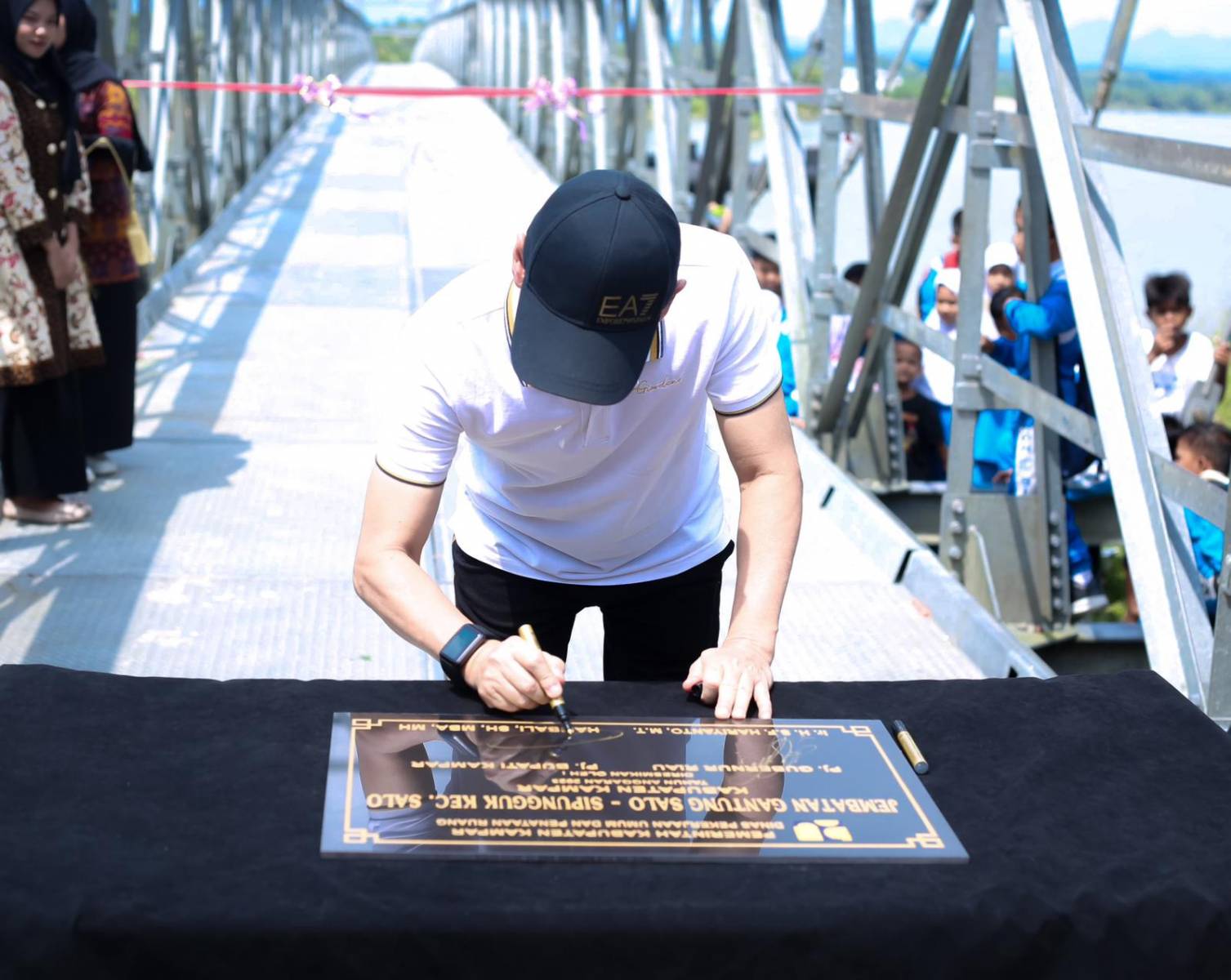 Peresmian Jembatan tersebut ditandai dengan penandatanganan prasasti dan pengguntingan pita yang disaksikan oleh Pj Sekda Kampar H. Ahmad Yuzar, S.Sos, MT, Kadis PUPR Provinsi Riau Arif, Danyon 132 BS Mayor Inf. Bambang Budi Hartanto, Dandim diwakili oleh Mayor Inf. Hendri Dunan, Kapolres Kampar mewakili serta Asisten dan Kepala OPD di lingkup Pemkab Kampar.