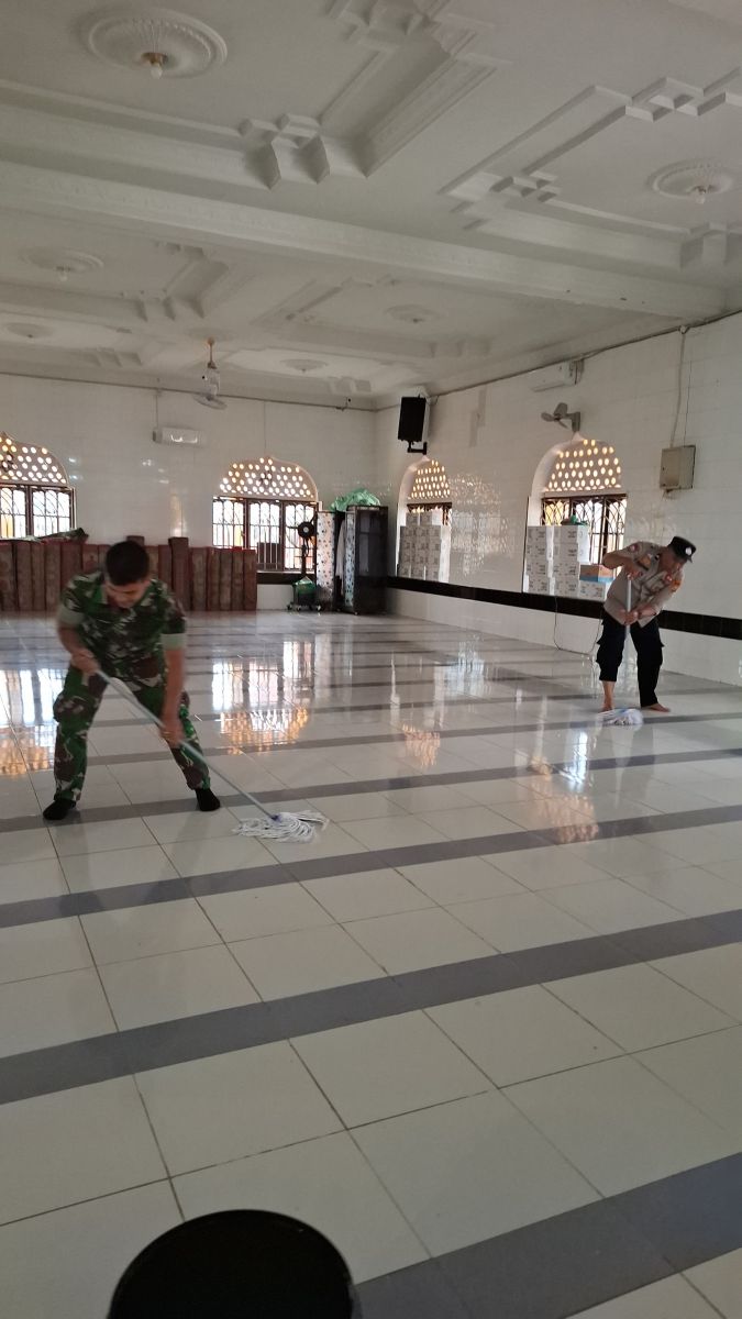 TEMPULING - Dalam rangka memperingati Hari Bhayangkara ke-79, Koramil 03/Tempuling bersama Polsek Tempuling melaksanakan kegiatan gotong royong bersama di Masjid Nurul Hidayah, Kelurahan Sungai Salak. Kegiatan ini merupakan bagian dari Bhakti Sosial Religi yang dilaksanakan di setiap Polsek di wilayah Kabupaten Indragiri Hilir. Senin(16/06/2025).