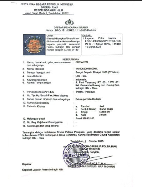 Indragiri Hilir, 7 Oktober 2025 — Penyidik Polres Indragiri Hilir secara resmi telah menerbitkan Daftar Pencarian Orang (DPO) terhadap seorang tersangka bernama Supianto, yang diduga terlibat dalam kasus tindak pidana penipuan jual beli lahan milik masyarakat di Desa Semambu Kuning, Kecamatan Gaung, Kabupaten Indragiri Hilir.