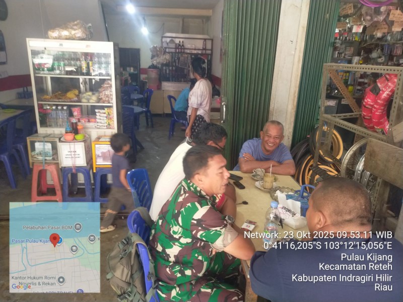 INHIL - Babinsa Koramil 07/RTH, Sertu Bendri, melaksanakan kegiatan Komunikasi Sosial (Komsos) bersama dengan masyarakat wilayah binaan, pada Rabu (23/10/2025) pukul 09.30 WIB. Kegiatan ini bertempat di RW 04 RT 01 Kelurahan Pulua Kijang, Kecamatan Reteh, Kabupaten Indragiri Hilir.