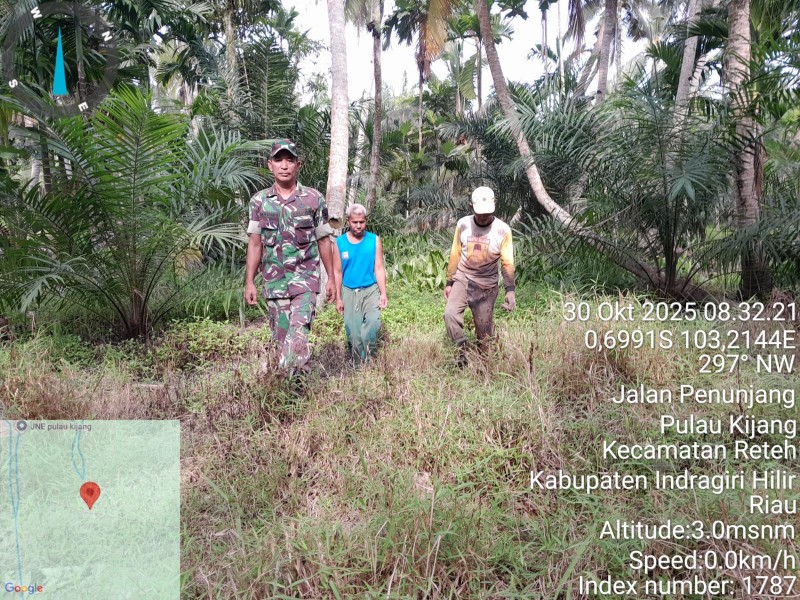 INHIL, MEDIALOKAL.CO -- Babinsa Koramil 07/RTH, Pelda Nofiandi, melaksanakan kegiatan patroli tapal batas di Parit 1, Kelurahan Pulau Kijang, Kecamatan Reteh, Kabupaten Indragiri Hilir, pada Kamis, 30 Oktober 2025. Kegiatan ini bertujuan untuk memantau situasi keamanan dan ketertiban di wilayah perbatasan.