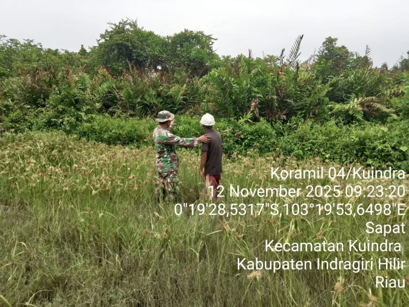 INHIL - Babinsa Koramil 04/Kuindra, Serda Teluk Dalam, melaksanakan patroli tapal batas di wilayah Parit 7, Desa Teluk Dalam, Kecamatan Kuindra, Kabupaten Indragiri Hilir, pada hari Rabu, 12 November 2025, pukul 09:00 WIB s/d 12:30 WIB.