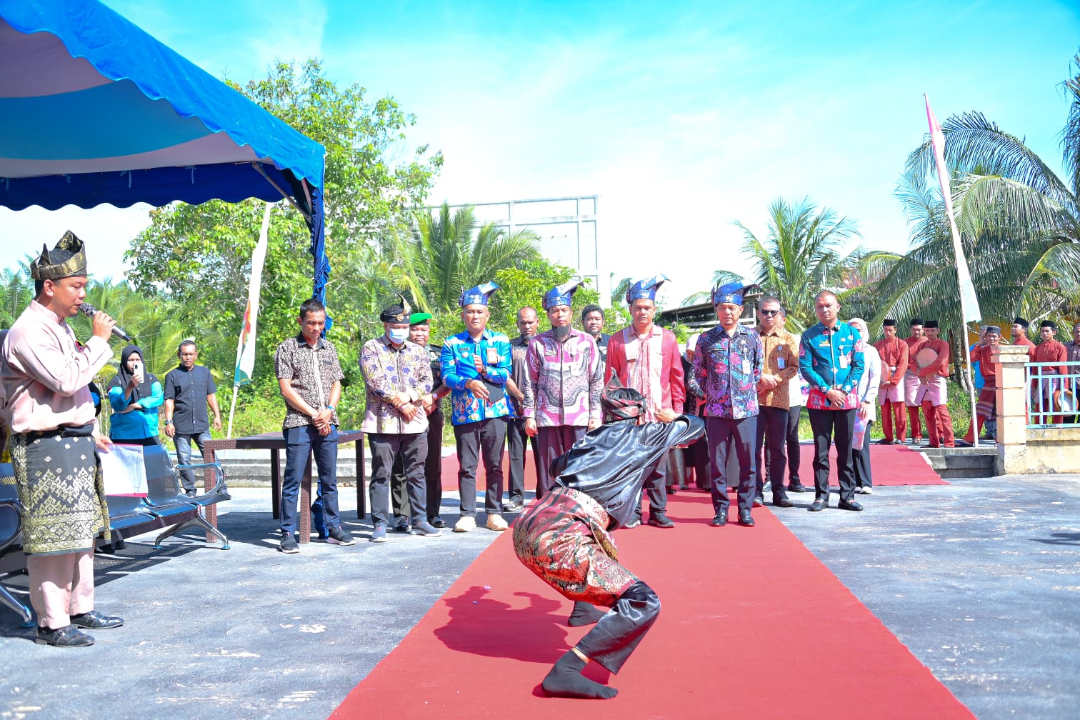Ket : Kedatangan Andris Warsono dan Rombongan Tim Penilai Provinsi Riau beserta Kepala Inspektorat Bengkalis disambut dengan silat persembahan.