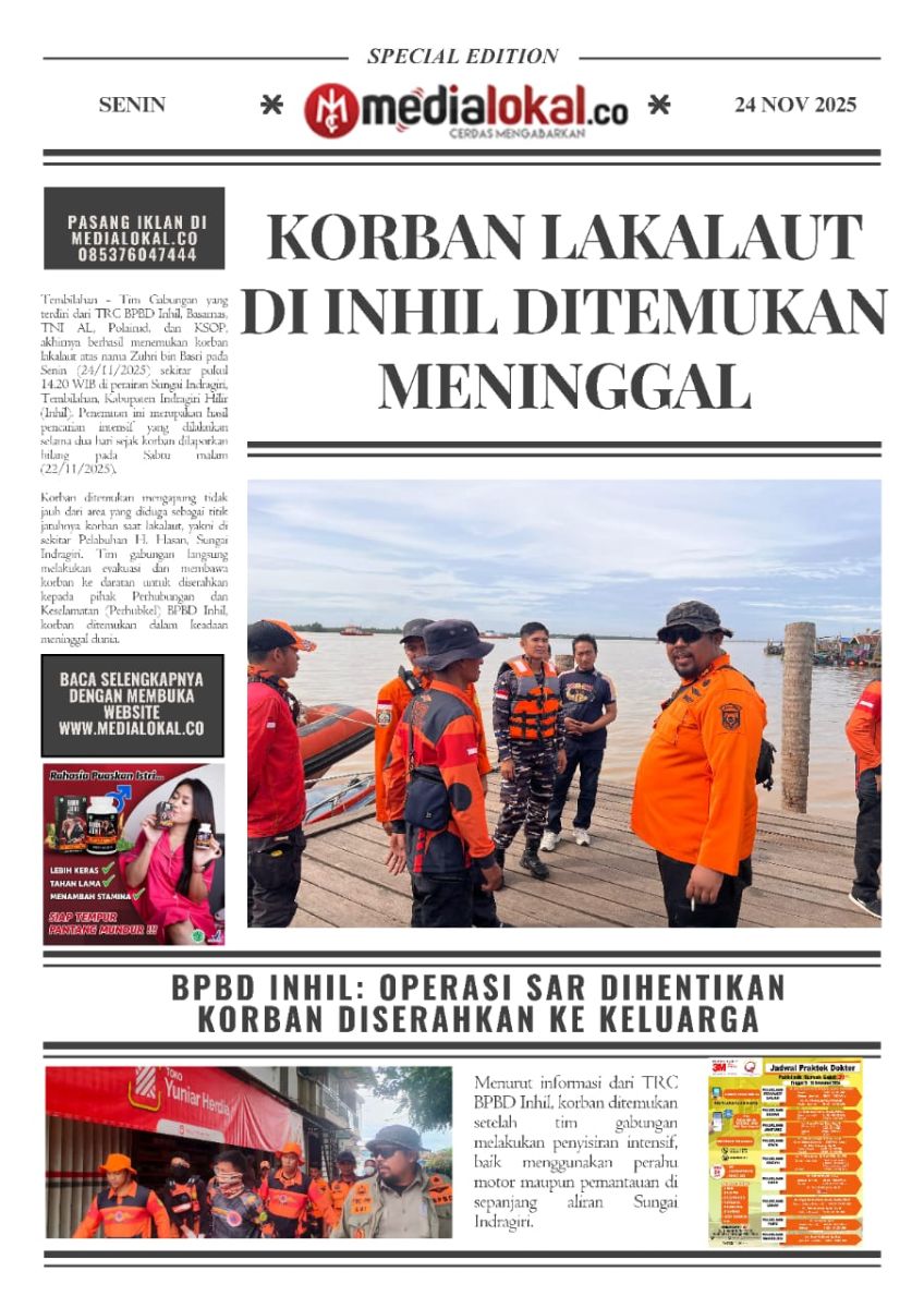TEMBILAHAN, Medialokal.co - Tim Gabungan yang terdiri dari TRC BPBD Inhil, Basarnas, TNI AL, Polairud, dan KSOP, akhirnya berhasil menemukan korban lakalaut atas nama Zuhri bin Basri pada Senin (24/11/2025) sekitar pukul 14.20 WIB di perairan Sungai Indragiri, Tembilahan, Kabupaten Indragiri Hilir (Inhil).