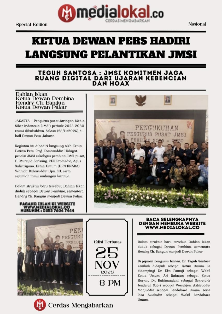 JAKARTA, Medialokal.co - Pengurus pusat Jaringan Media Siber Indonesia (JMSI) periode 2025-2030 resmi dikukuhkan, Selasa (25/11/2025) di hall Dewan Pers, Jakarta.