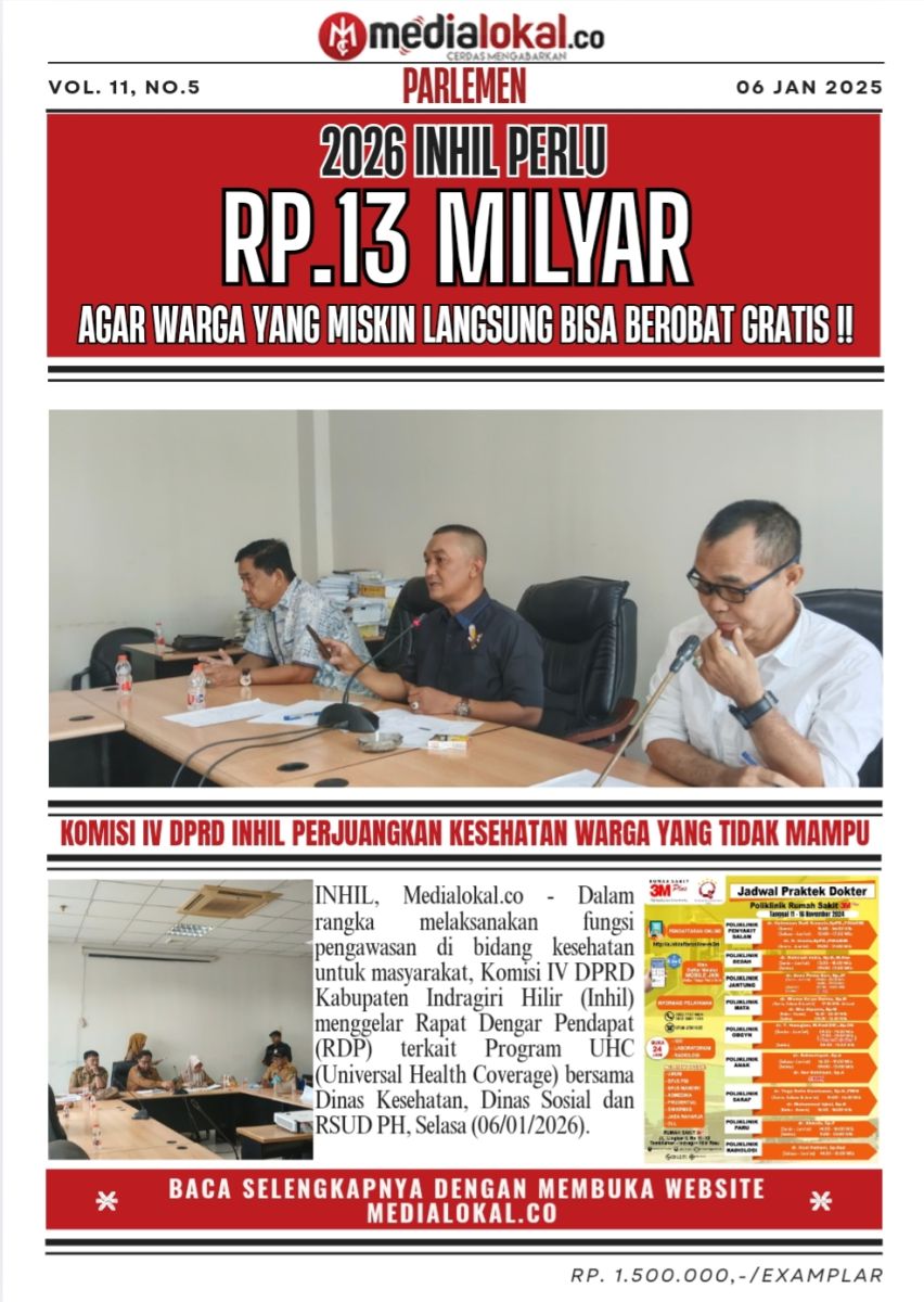 INHIL, Medialokal.co - Dalam rangka melaksanakan fungsi pengawasan di bidang kesehatan untuk masyarakat, Komisi IV DPRD Kabupaten Indragiri Hilir (Inhil) menggelar Rapat Dengar Pendapat (RDP) terkait Program UHC (Universal Health Coverage) bersama Dinas Kesehatan, Dinas Sosial dan RSUD PH, Selasa (06/01/2026).