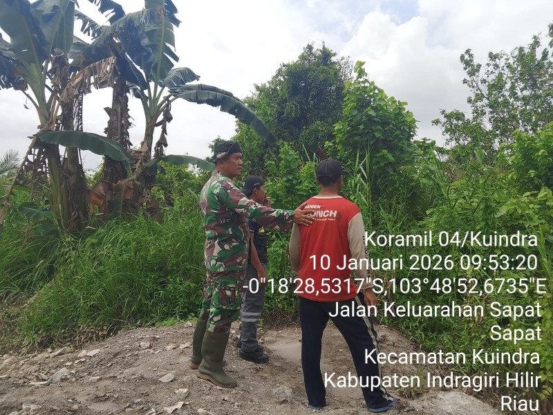 INHIL, Medialokal.co - Babinsa Koramil 04. KDR, melaksanakan patroli tapal batas di wilayah parit 15, Desa Teluk Dalam, Kecamatan Kuindra, Kabupaten Indragiri Hilir, pada Sabtu, 10 Januari 2026, pukul 09:00 WIB.