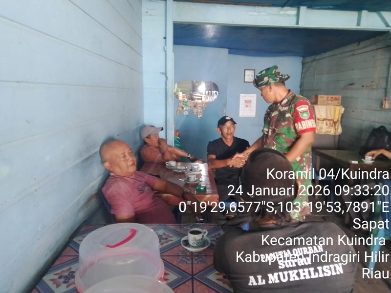 INHIL, Medialokal.co - Koramil 04/Kuindra melaksanakan kegiatan Komunikasi Sosial (Komsos) di Kampung Pancasila, Kelurahan Sapat, Kecamatan Kuindra, Kabupaten Indragiri Hilir, pada Sabtu (24/1/2026). Kegiatan ini dipimpin oleh Babinsa Serda Erwin Savitri, dengan tujuan untuk meningkatkan kesadaran masyarakat akan pentingnya nilai-nilai luhur Pancasila dalam kehidupan sehari-hari.