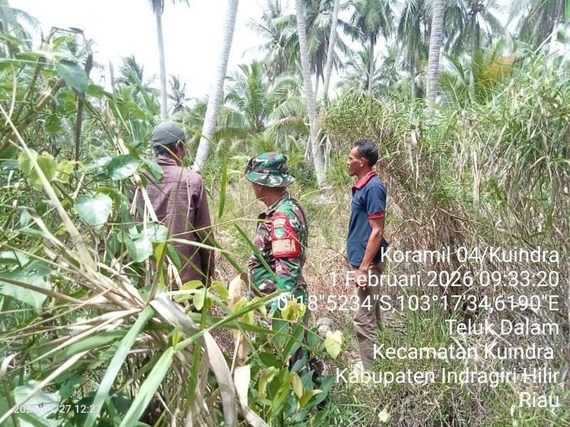 INHIL, Medialokal.co - Babinsa Koramil 04/KDR, Kodim 0314/Inhil, Serda Margono, melaksanakan patroli tapal batas di Parit 4 Desa Teluk Dalam, Kecamatan Kuindra, Kabupaten Indragiri Hilir, pada Sabtu (7/2/2026) pukul 09.00 WIB s/d 12.30 WIB. Kegiatan ini bertujuan untuk meningkatkan kesadaran masyarakat akan pentingnya menjaga keamanan dan ketertiban di wilayah tapal batas.