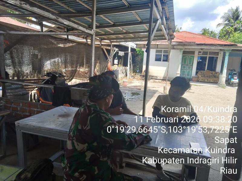 INHIL, MEDIALOKAL.CO -- Babinsa Koramil 04/Kuindra, Serda Erwin Savitri, melaksanakan kegiatan Komunikasi Sosial (Komsos) di Kampung Pancasila, Kelurahan Sapat, Kec. Kuindra, Kab. Indragiri Hilir, pada Rabu, 11 Februari 2026, pukul 09:00 WIB.
