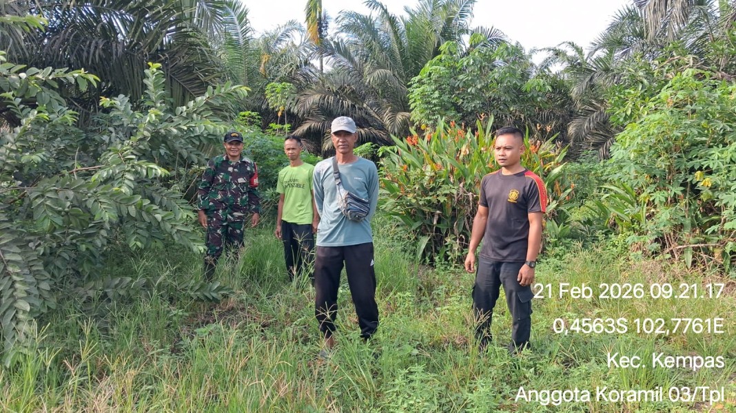 KEMPAS - Babinsa Koramil 03/Tpl Kodim 0314/Inhil Serma Damrianto melaksanakan kegiatan patroli kebakaran hutan dan lahan (Karhutla) di Desa Bayas Jaya Kecamatan Kempas, Kabupaten Inhil, Sabtu (21/02/2026).