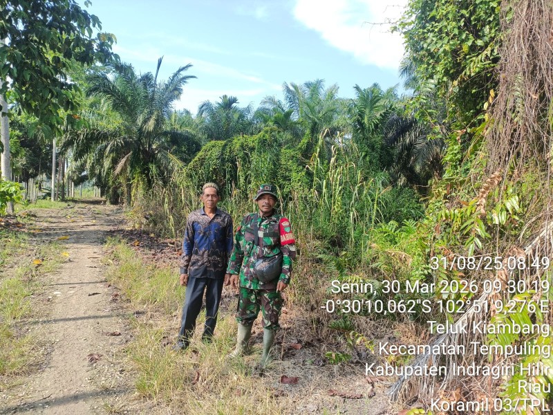 TEMPULING - Senin yang cerah, tanggal 30 Maret 2026 pukul 09.30 hingga 10.30 WIB, Babinsa Koramil 03/Tpl Kopka RH. Tambunan melaksanakan patroli tapal batas guna mengantisipasi kebakaran hutan dan lahan (Karhutla) di Desa Teluk Kiambang, Kecamatan Tempuling, Kabupaten Indragiri Hilir (Inhil). Kegiatan ini merupakan bagian dari upaya rutin TNI dalam menjaga keamanan wilayah dan mencegah potensi bencana yang dapat mengganggu kenyamanan serta keselamatan masyarakat.