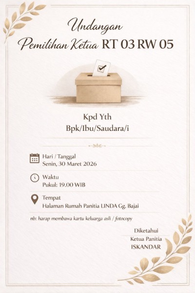 Cerita warga yang gagal memilih RT baru itu disampaikan para warga dengan penuh kekesalan. Pasalnya, para ibu-ibu warga RT 03 sudah sibuk menyiapkan konsumsi untuk kebutuhan pemilihan. Undangan sudah disebarkan sejak sore dan warga sudah bersiap-siap untuk memilih. Tapi tidak jadi!