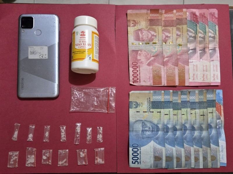 Dari hasil penggeledahan, polisi menemukan sejumlah barang bukti berupa 13 paket diduga sabu yang dikemas dalam pipet plastik, satu unit handphone merk Realme, serta uang tunai sebesar Rp1.000.000.