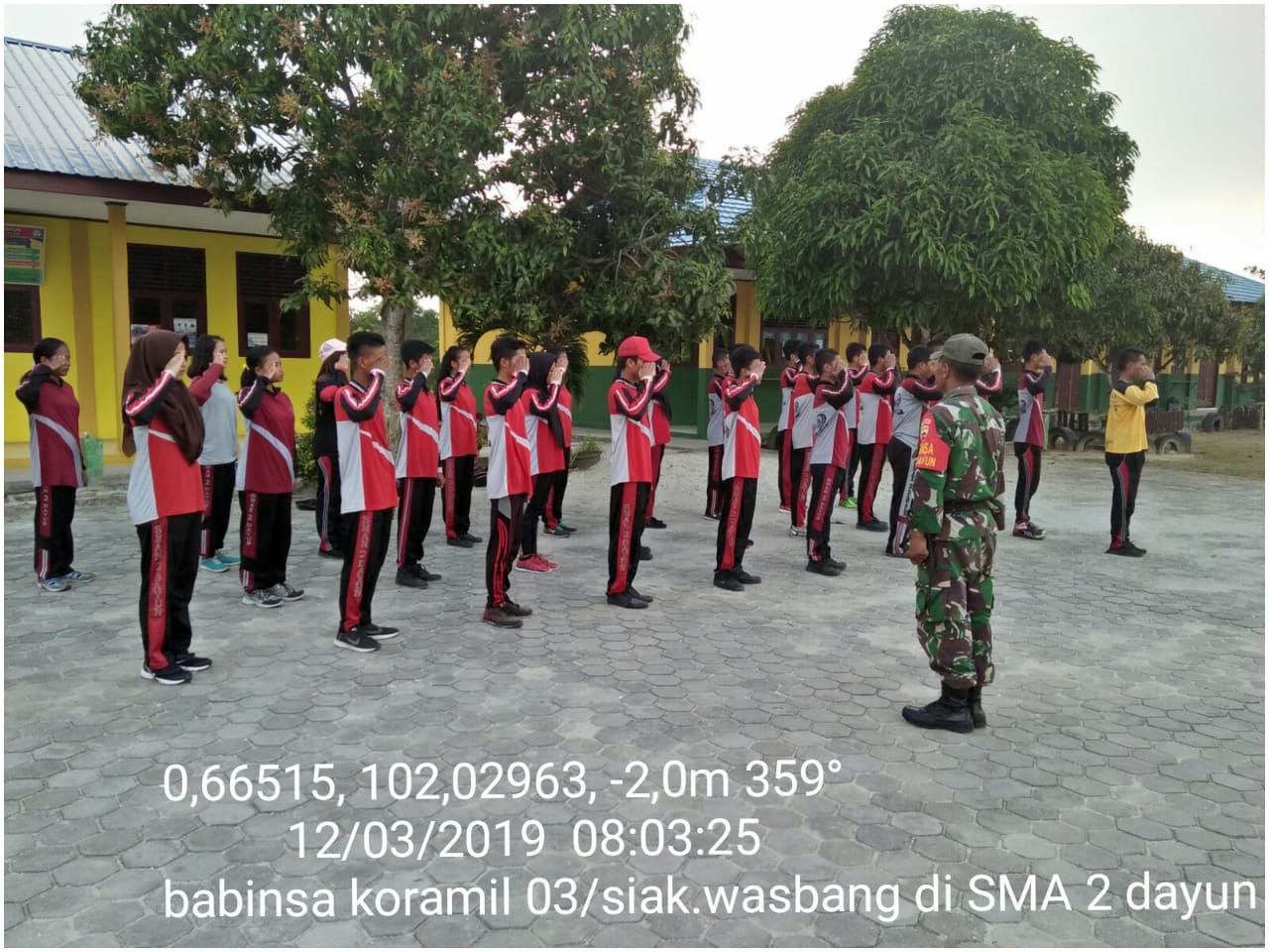 Babinsa Kecamatan Dayun, Serma Zamzami memberikan penguatan dan pembekalan Wawasan kebangsaan di SMU Negeri 2 Kecamatan Dayun Kabupaten Siak dengan materi Pembinaan Mental dan Pelatihan PBB, sedangkan Serka Arifin memberikan penguatan dan Pembekalan Wawasan Kebangsaan di SMU Negeri 2 Suak Lanjut Kecamatan Siak, kabupaten Siak dengan materi penguatan Mental dan Pentingnya peran Generasi Muda dalam menjaga keberagaman dalam rangka keutuhan NKRI.