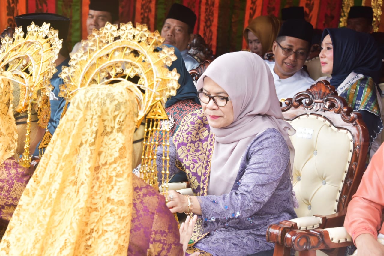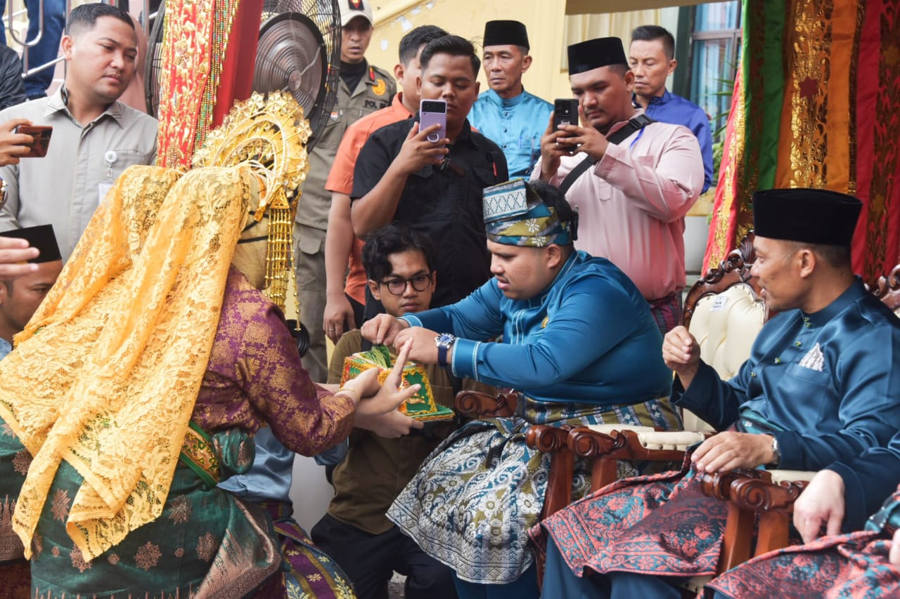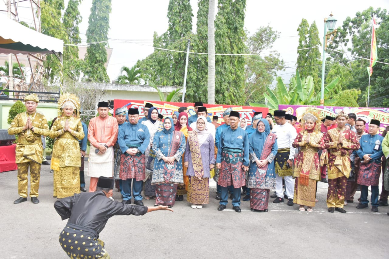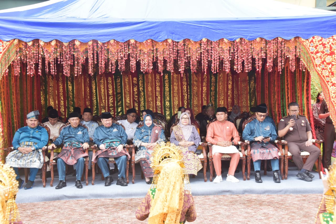 Usai melewati jajaran bunga manggar, rombongan Bupati Kasmarni yang didampingi Wakil Bupati dan Bupati ke-14 Bengkalis Amril Mukminin dan unsur Forkopimda Kabupaten Bengkalis dan diapit oleh bujang dan dara
