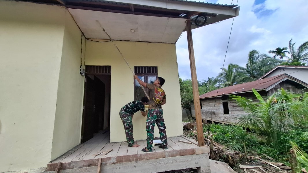 Percantik Rumah, Satgas TMMD Kodim 0314/Inhil Cat Plafon Teras RTLH Desa Karya Tunas Jaya