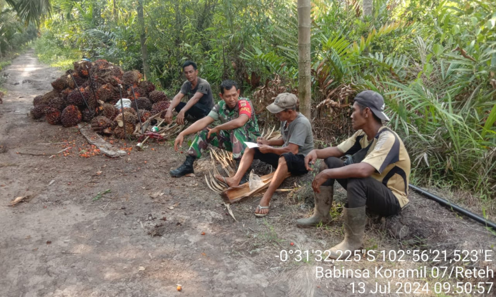 Canda dan Tawa Hiasi Kebersamaan Warga dan Babinsa di Reteh di Sela-sela Aktivitas Warga Memanen Sawit