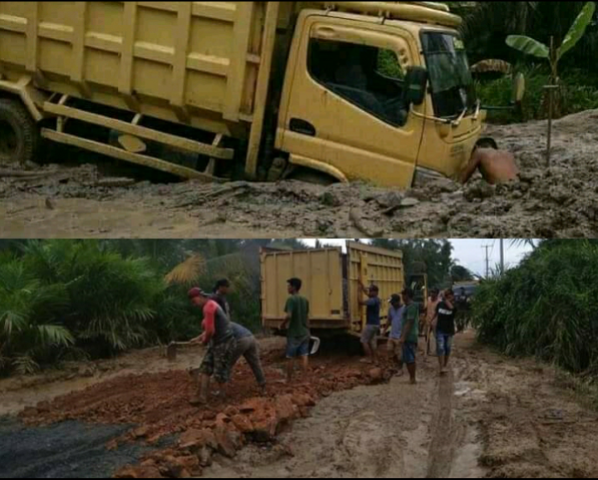 Jalan Kuala Keritang Berlumpur dan Seperti Bubur, Masyarakat Timbun Jalan dengan Dana Swasembada